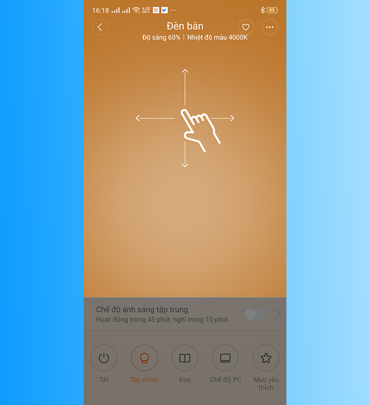Để tùy chỉnh cường độ ánh sáng của đèn Xiaomi, bạn chọn vào mục Tùy chỉnh (Custom) rồi vuốt tay trên giao diện màn hình từ dưới lên, trái sang phải để tăng giảm độ sáng, nhiệt độ màu (màu sắc đèn bàn).