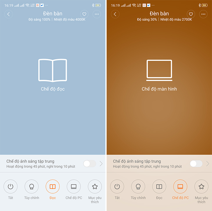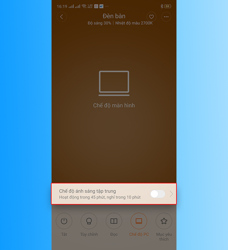 Để kích hoạt Chế độ tập trung, bạn chỉ cần gạt thanh gạt "Chế độ ánh sáng tập trung" sang bên phải. Lưu ý, chế độ này sẽ hoạt động trong 45 phút, sau đó tự tắt trong 10 phút để bảo vệ sức khỏe cho đôi mắt của bạn.
