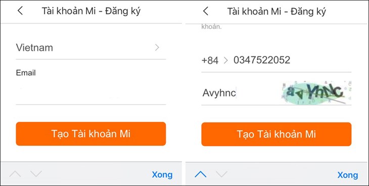 Bước 2: Bạn có thể dùng số điện thoại hoặc tài khoản email để đăng ký > Sau khi hoàn tất, nhấn Tạo tài khoản Mi.