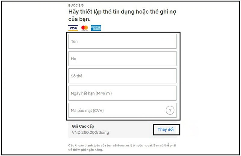 - Bước 5: Nhập đầy đủ thông tin thanh toán theo yêu cầu, bao gồm: tên chủ thẻ, số thẻ, ngày hết hạn và mã bảo mật (CVV). Sau khi hoàn tất, nhấn Xác nhận để kích hoạt tài khoản.