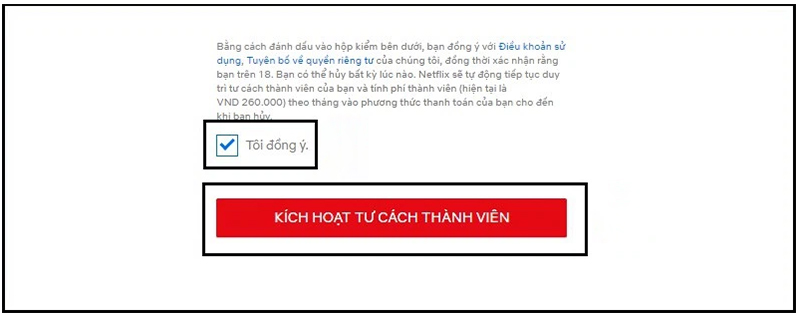 - Bước 6: Đọc kỹ các điều khoản và điều kiện của Netflix. Nếu bạn đồng ý, tick vào ô xác nhận, sau đó nhấn chọn “Kích hoạt tư cách thành viên” để hoàn tất quá trình đăng ký.