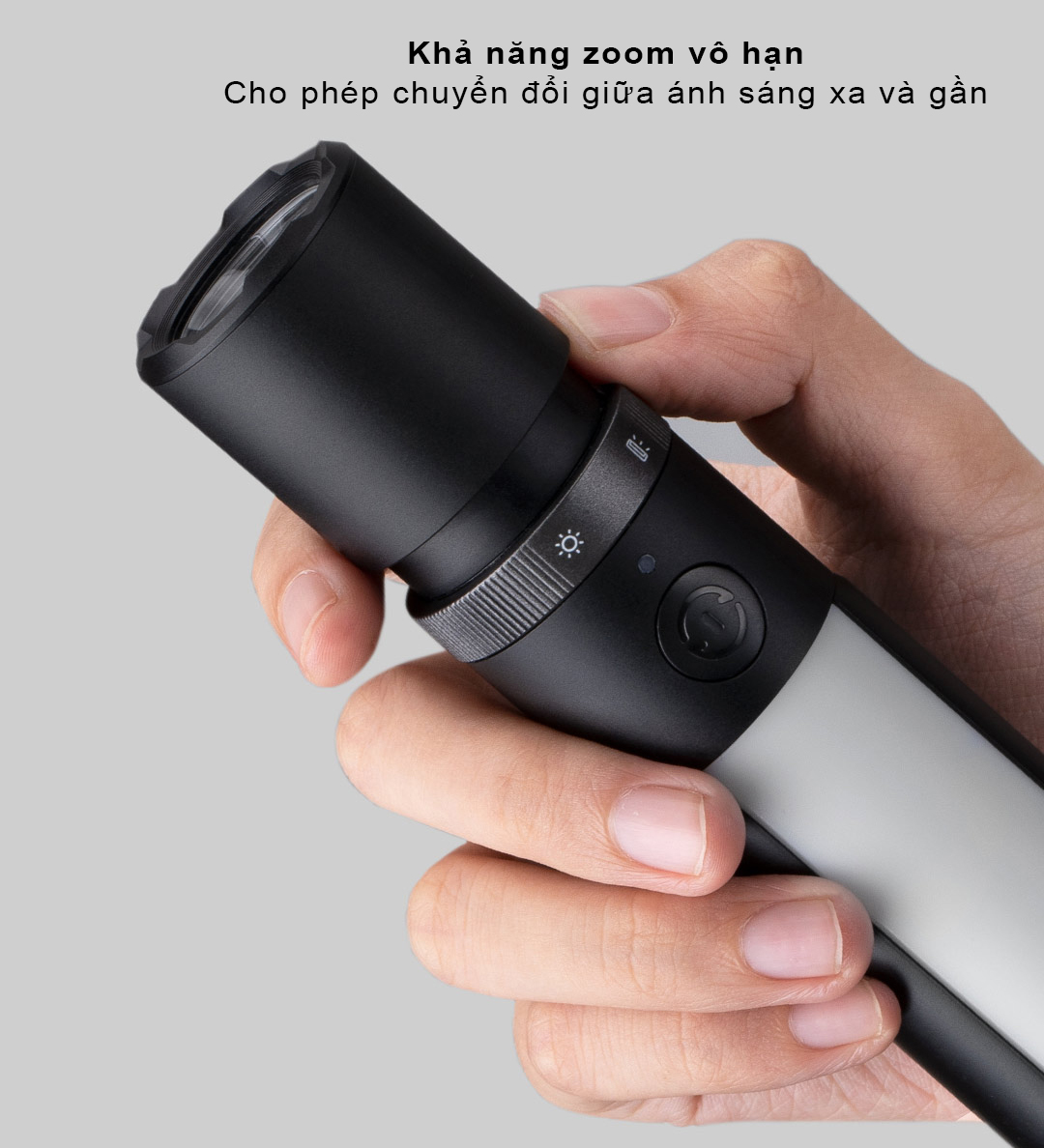Phần đầu của Đèn pin đa năng Xiaomi Mijia MJSDT002QW được thiết kế đặc biệt với tính năng zoom vô hạn, tương tự như cơ chế hoạt động của kính thiên văn. Điều này cho phép người dùng dễ dàng điều chỉnh và thu phóng ánh sáng một cách linh hoạt, từ chùm tia hẹp tập trung cho khoảng cách xa đến chùm tia rộng bao phủ vùng quan sát gần.