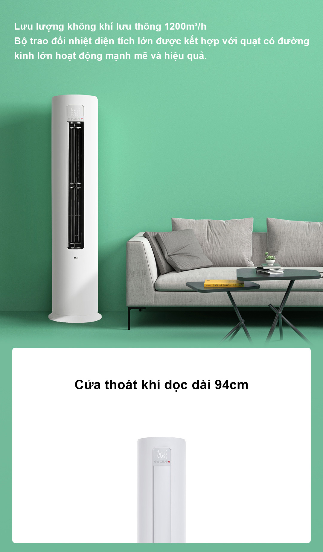 Điều hòa cây Xiaomi Inverter 27000BTU N1A3 - 2 chiều được thiết kế với cửa thoát khí thẳng đứng dài 94cm, kết hợp cùng hệ thống quạt gió và đường dẫn gió được tinh chỉnh tối ưu, mang đến luồng gió êm ái, lan tỏa đều khắp không gian. Luồng khí này có thể len lỏi vào mọi ngóc ngách trong phòng mà không gây cảm giác khó chịu hay gió lạnh trực tiếp, giúp tạo nên môi trường thoáng mát, dễ chịu cho người dùng.