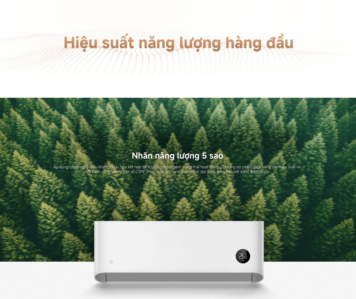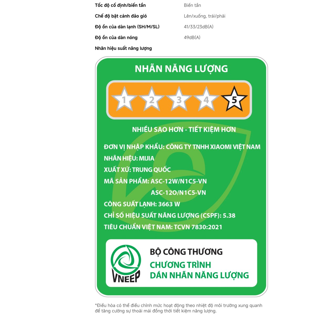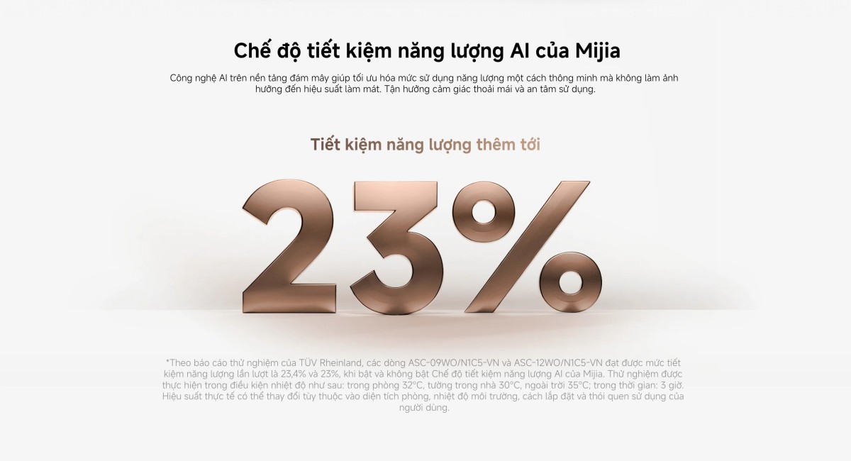 Sản phẩm được trang bị công nghệ Inverter kết hợp cùng trí tuệ nhân tạo (AI), cho hiệu quả tiết kiệm điện năng đáng kinh ngạc. Nhờ chế độ Mijia AI Energy Saving Mode, máy điều hòa Mijia 1.5 HP ASC-12WO/N1C5-VN có khả năng học hỏi cũng như tự động tối ưu công suất làm lạnh dựa trên nền tảng đám mây. Giúp thiết bị hạn chế tiêu hao điện năng dư thừa, duy trì nhiệt độ ổn định, mang đến không gian mát mẻ, thoải mái. Máy còn kiểm soát ngưỡng nhiệt độ, hạn chế tiếng ồn thích ứng linh hoạt với môi trường. Nhờ vậy, máy hoạt động ổn định, giảm dao động nhiệt, từ đó giúp bạn tiết kiệm chi phí điện hàng tháng mà vẫn không ảnh hưởng đến hiệu quả làm mát. Chỉ số hiệu suất năng lượng CSPF đạt 5.38 và chứng nhận 5 sao, Xiaomi Mijia Inverter 12500 BTU 1 Chiều ASC-12WO/N1C5-VN là sự lựa chọn hoàn hảo, giúp gia đình bạn tận hưởng không gian mát lạnh thông minh, tiết kiệm điện năng lâu dài.
