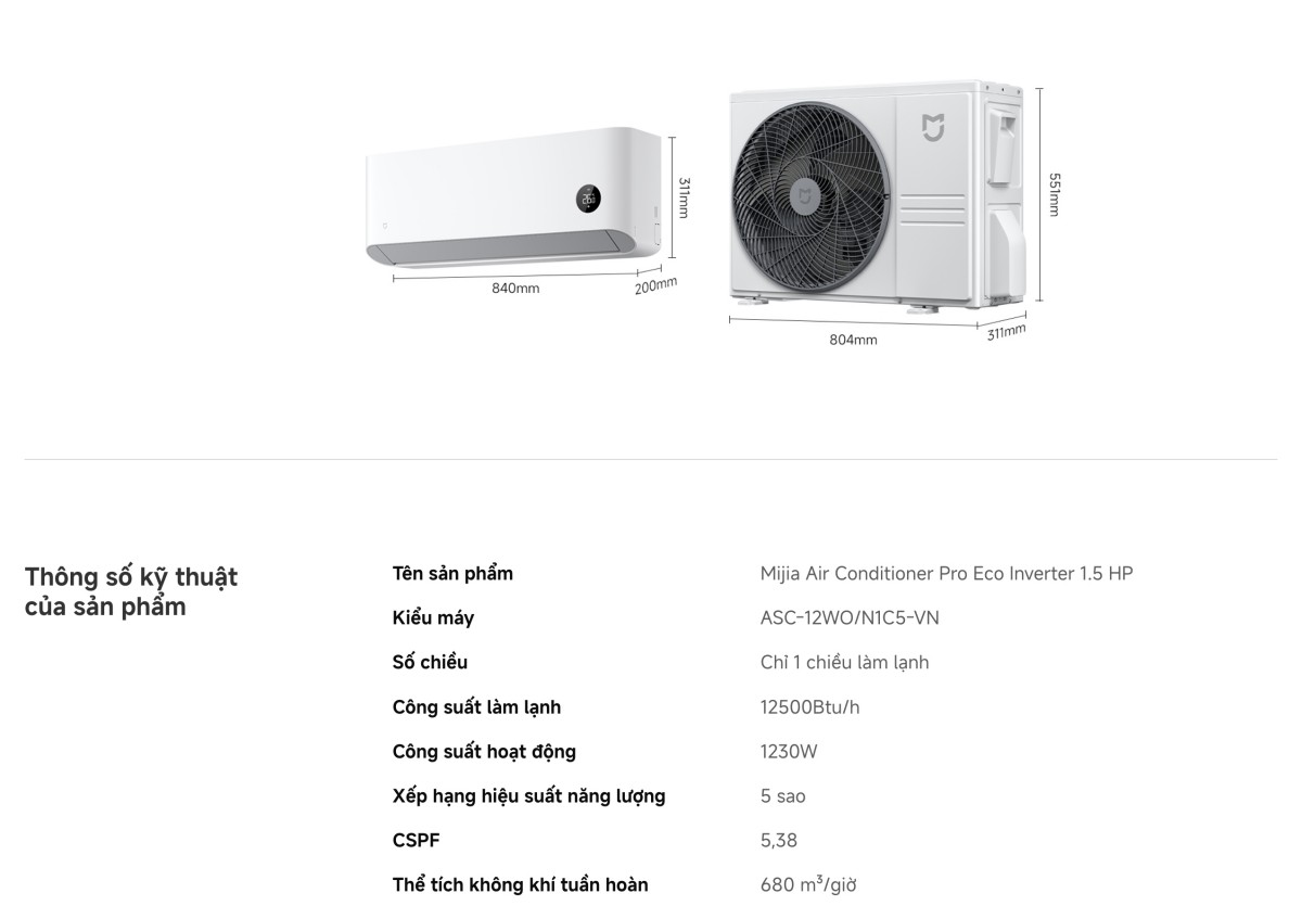 Điều hòa Xiaomi Mijia Pro Eco Inverter 1.5 HP ASC-12WO/N1C5-VN nổi bật nhờ công suất 12500 BTU, máy làm lạnh hiệu quả các phòng lớn, đạt lưu lượng gió 680m³/h giúp làm mát chỉ trong 30s. Chế độ Mijia AI giúp tiết kiệm năng lượng, vận hành êm ái với độ ồn tối đa chỉ 49dB. Không những thế, bạn có thể dễ dàng điều khiển máy qua Xiaomi Home và an tâm sử dụng nhờ tính năng tự làm sạch dàn lạnh tiện lợi.