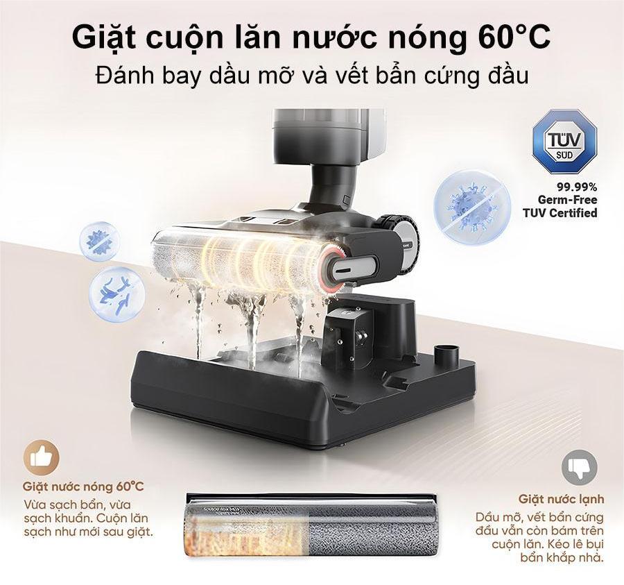 Một trong những tính năng đắt giá nhất trên Dreame H13 Pro chính là khả năng tự vệ sinh cuộn lăn bằng nước nóng 60°C. Nhiệt độ cao giúp loại bỏ dầu mỡ, vết bẩn cứng đầu và vi khuẩn hiệu quả, đồng thời giữ cho sàn nhà luôn sạch khuẩn và không có mùi ẩm mốc.
