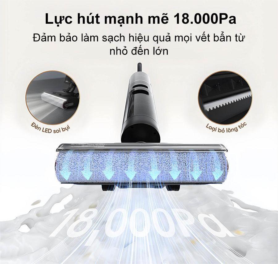 Sức hút mạnh mẽ lên đến 18.000Pa cùng chổi xoay tốc độ 520 vòng/phút giúp Dreame H13 Pro dễ dàng hút sạch các loại bụi bẩn từ nhỏ đến lớn, từ vụn thức ăn, lông thú cưng đến các vết bẩn cứng đầu bám trên sàn.