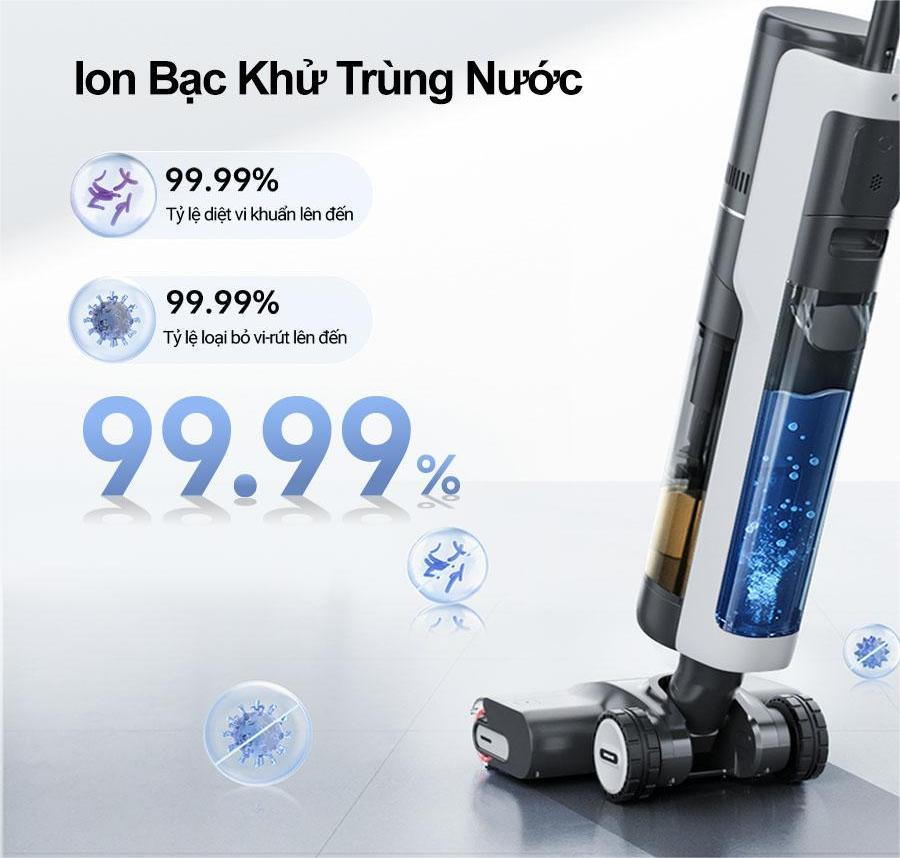 Không chỉ dừng lại ở việc làm sạch, Dreame H13 Pro còn ứng dụng công nghệ điện phân nước và cuộn lăn ion bạc, giúp diệt khuẩn lên đến 99,99% mà không cần dùng hóa chất.