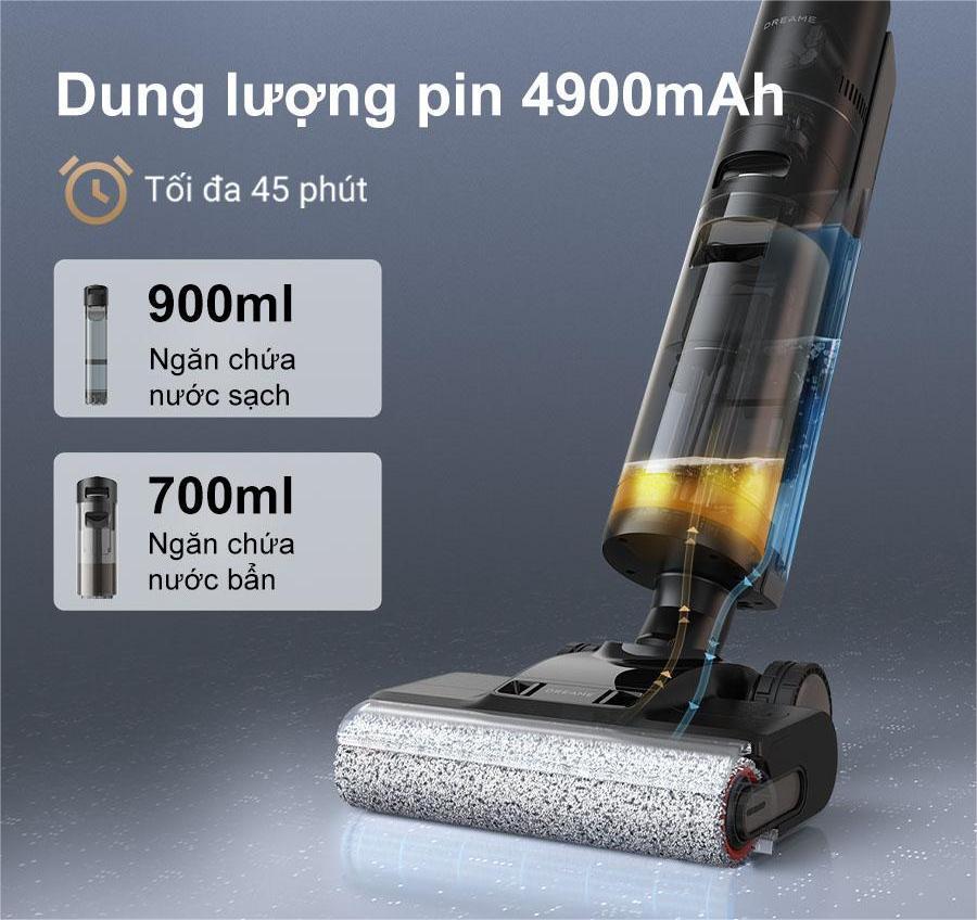 Sở hữu viên pin dung lượng lớn 4.900mAh, Dreame H13 Pro có thể hoạt động liên tục lên đến 45 phút, đủ để làm sạch toàn bộ không gian sống lên đến 300m² chỉ với một lần sạc.