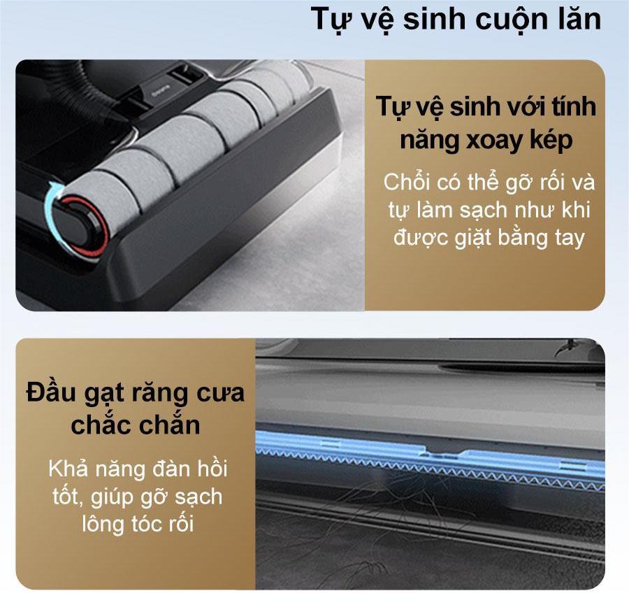 Khả năng tự vệ sinh con lăn là điểm mạnh của Dreame H13 Pro. Với hệ thống xoay kép (xoay thuận & xoay nghịch chiều kim đồng hồ), kết hợp với đầu gạt răng cưa đàn hồi, máy có thể: