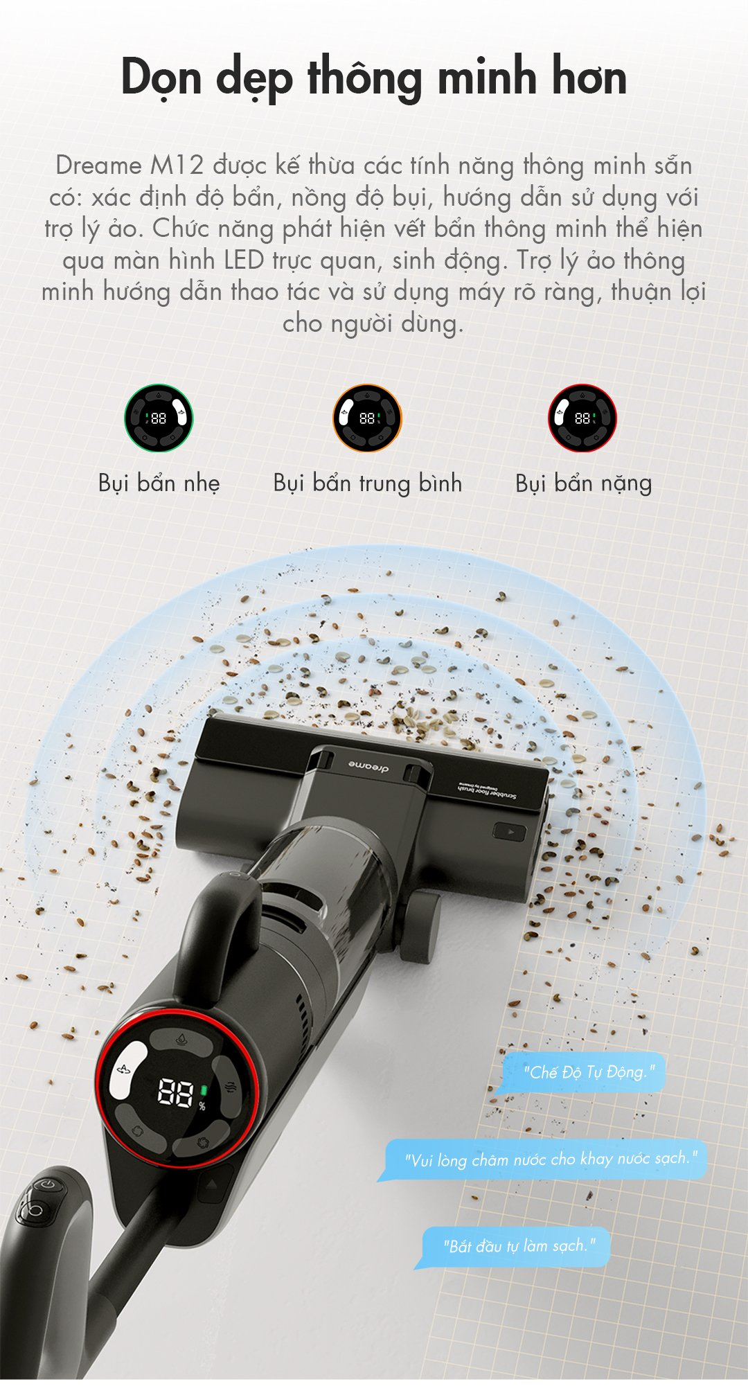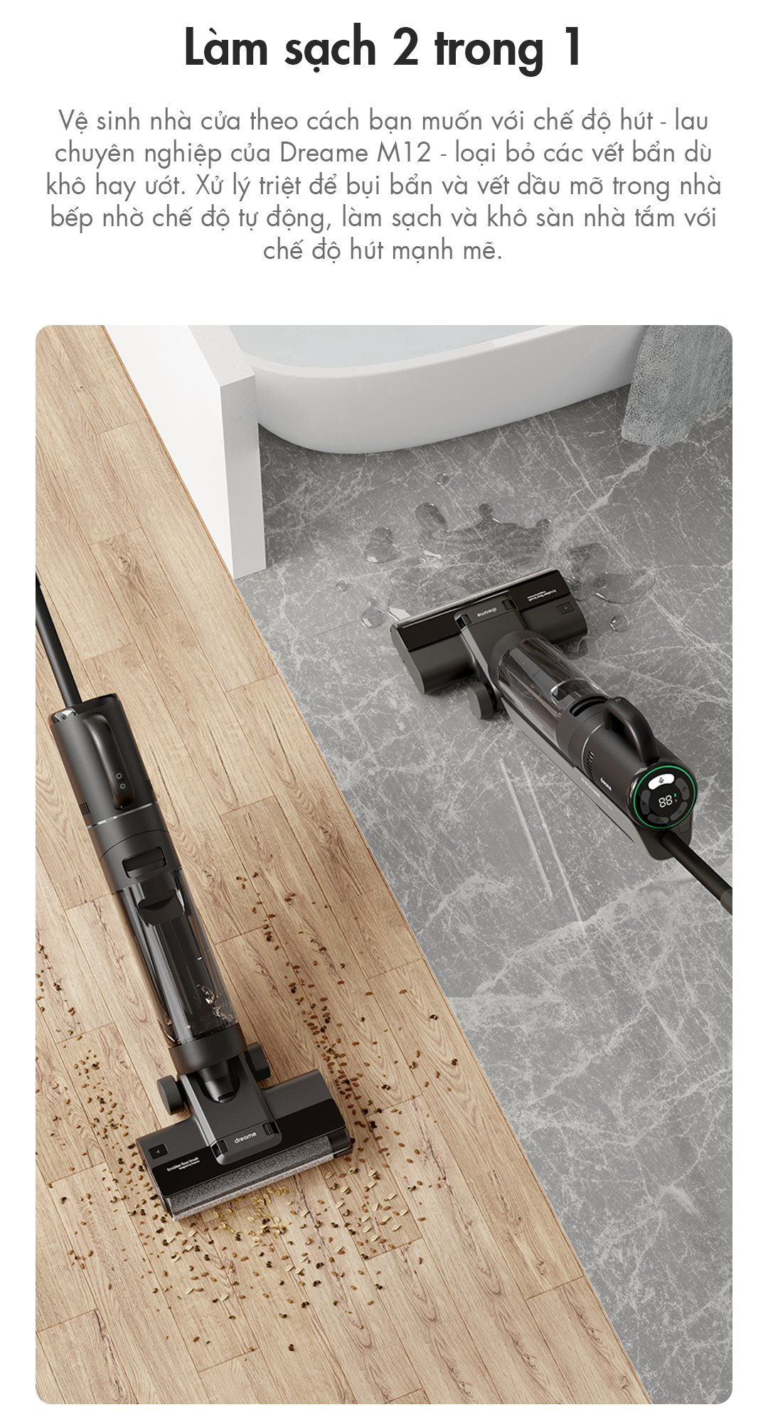 Dreame M12 Combo – Bản quốc tế không chỉ làm sạch bụi bẩn khô thông thường mà còn xử lý nhanh gọn các vết bẩn ướt, bám dính. Sản phẩm đặc biệt phù hợp với những gia đình có trẻ nhỏ, thú cưng hoặc cần vệ sinh nhiều khu vực sàn cứng như sàn gỗ, gạch, gốm...