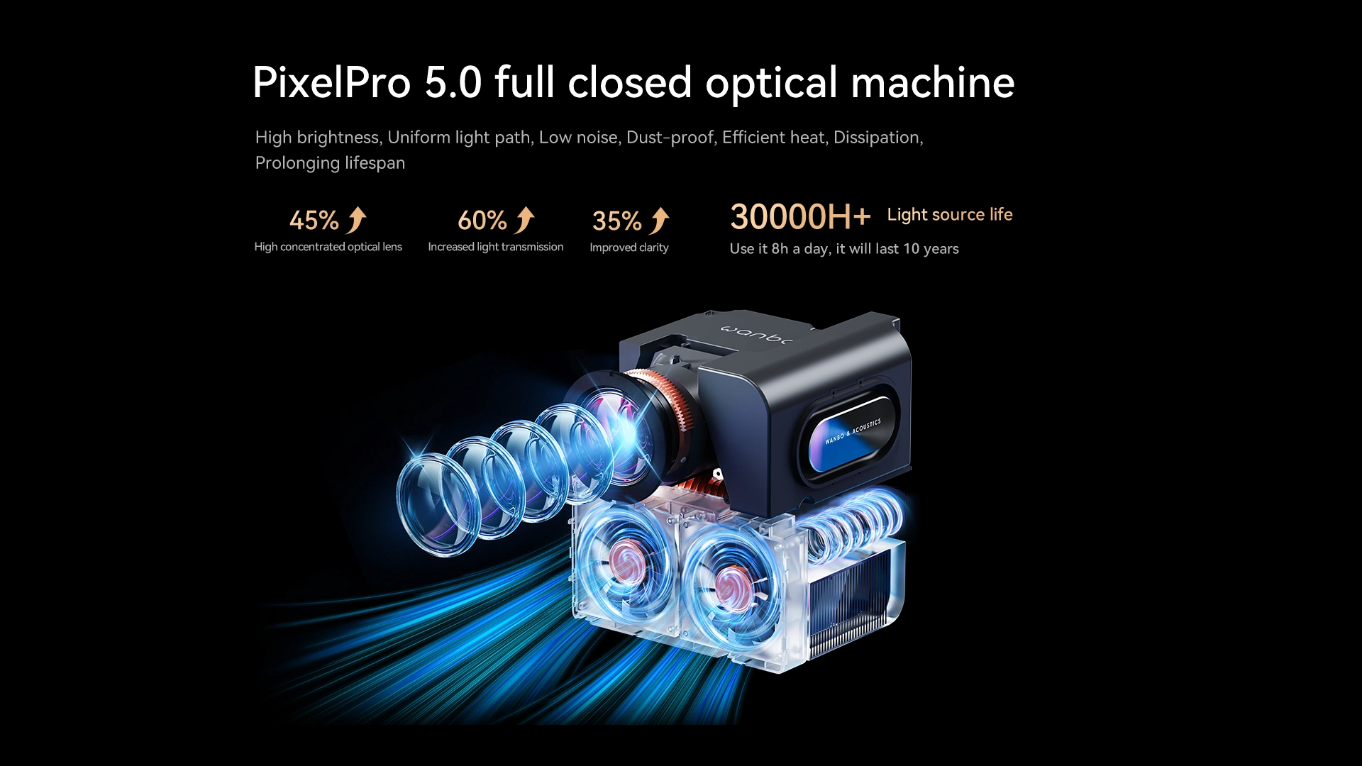Máy chiếu Wanbo Mozart 1 Pro được trang bị màn chiếu LCD PixelPro 5.0, đánh dấu một bước tiến lớn trong ngành máy chiếu gia đình. Với độ sáng ấn tượng 900 ANSI lumens, hình ảnh luôn sắc nét và rực rỡ, ngay cả trong không gian nhiều ánh sáng. Ống kính quang học 5 lớp cao cấp giúp tối ưu hóa ánh sáng, tái tạo hình ảnh sống động và chi tiết chân thực. Đây chắc chắn là lựa chọn hoàn hảo cho những tín đồ đam mê phim ảnh hay game, mang đến trải nghiệm giải trí đỉnh cao ngay tại nhà.