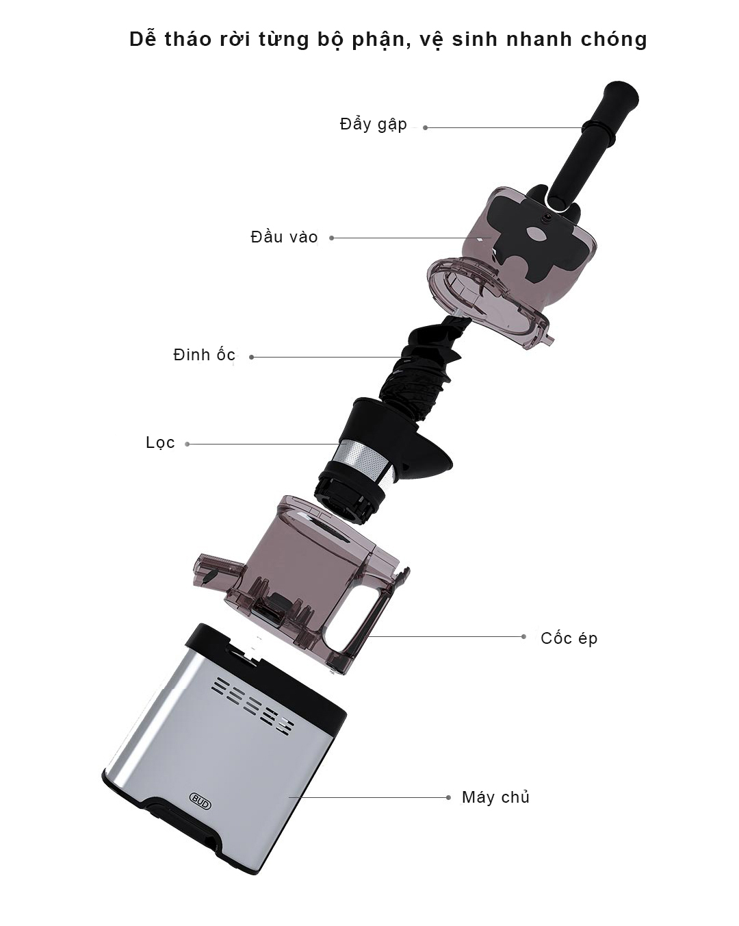 Máy ép chậm Xiaomi BUD BJ36 tích hợp cơ chế tách nước và bã riêng biệt, nhờ vậy: