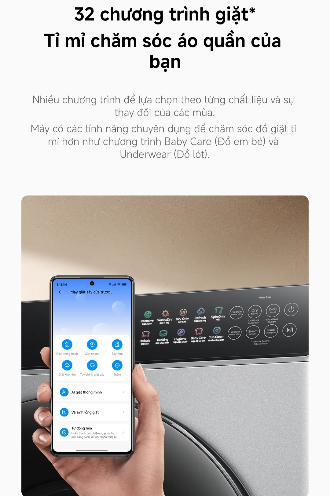 Đặc biệt, các chế độ Baby Care (Đồ em bé) và Underwear (Đồ lót) mang đến sự an tâm tuyệt đối khi giặt những loại đồ cần sự chăm sóc riêng biệt.