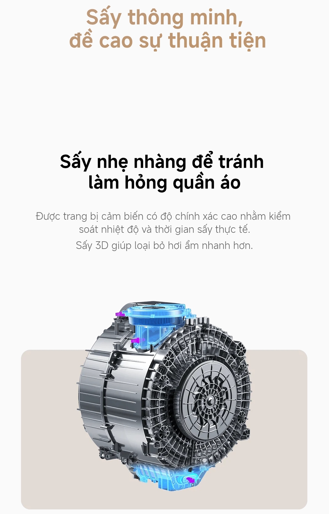 Hệ thống sấy 3D giúp loại bỏ hơi ẩm nhanh chóng, giữ cho quần áo luôn mềm mại.