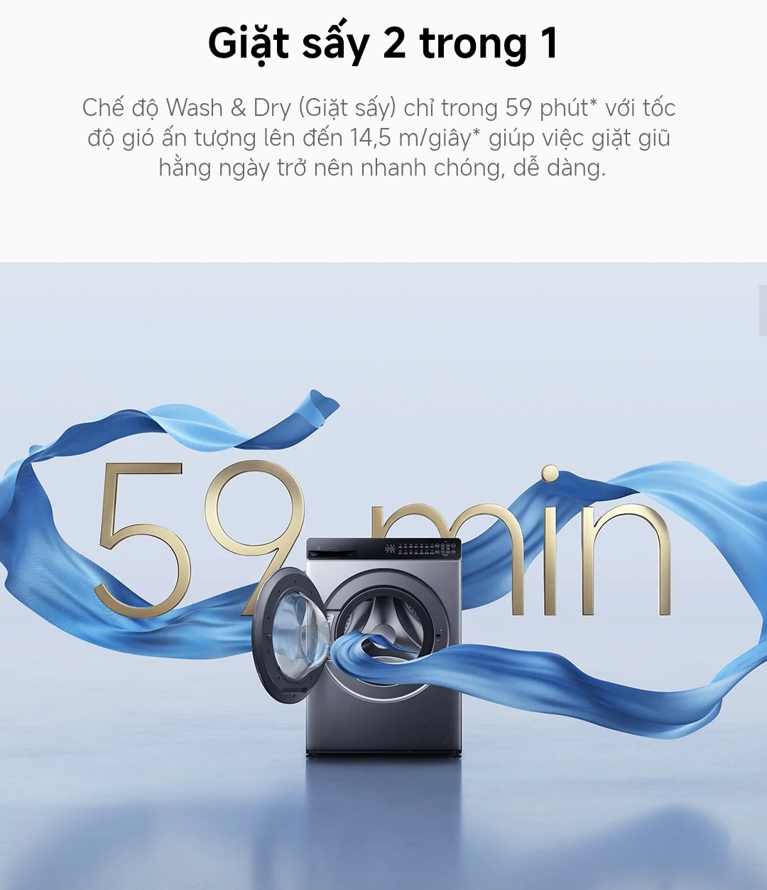 Giặt sấy 2 trong 1 – Tiết kiệm thời gian tối đaVới chế độ Wash & Dry, chỉ trong 59 phút, quần áo được giặt sạch và sấy khô hoàn hảo.