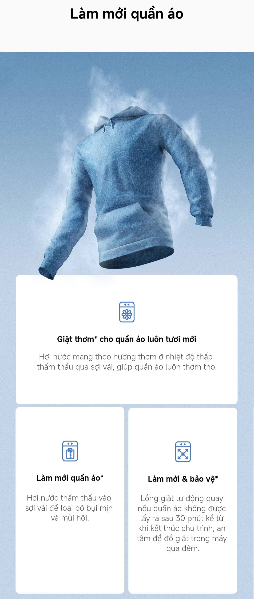 Giặt thơm: Hơi nước ở nhiệt độ thấp mang theo hương thơm, thẩm thấu vào từng sợi vải, giúp áo quần luôn tươi mới.