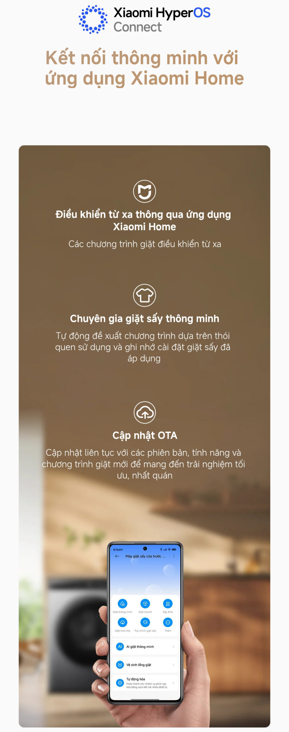 Cập nhật OTA: Luôn được nâng cấp phần mềm, bổ sung chương trình giặt mới, mang lại trải nghiệm tối ưu theo thời gian.