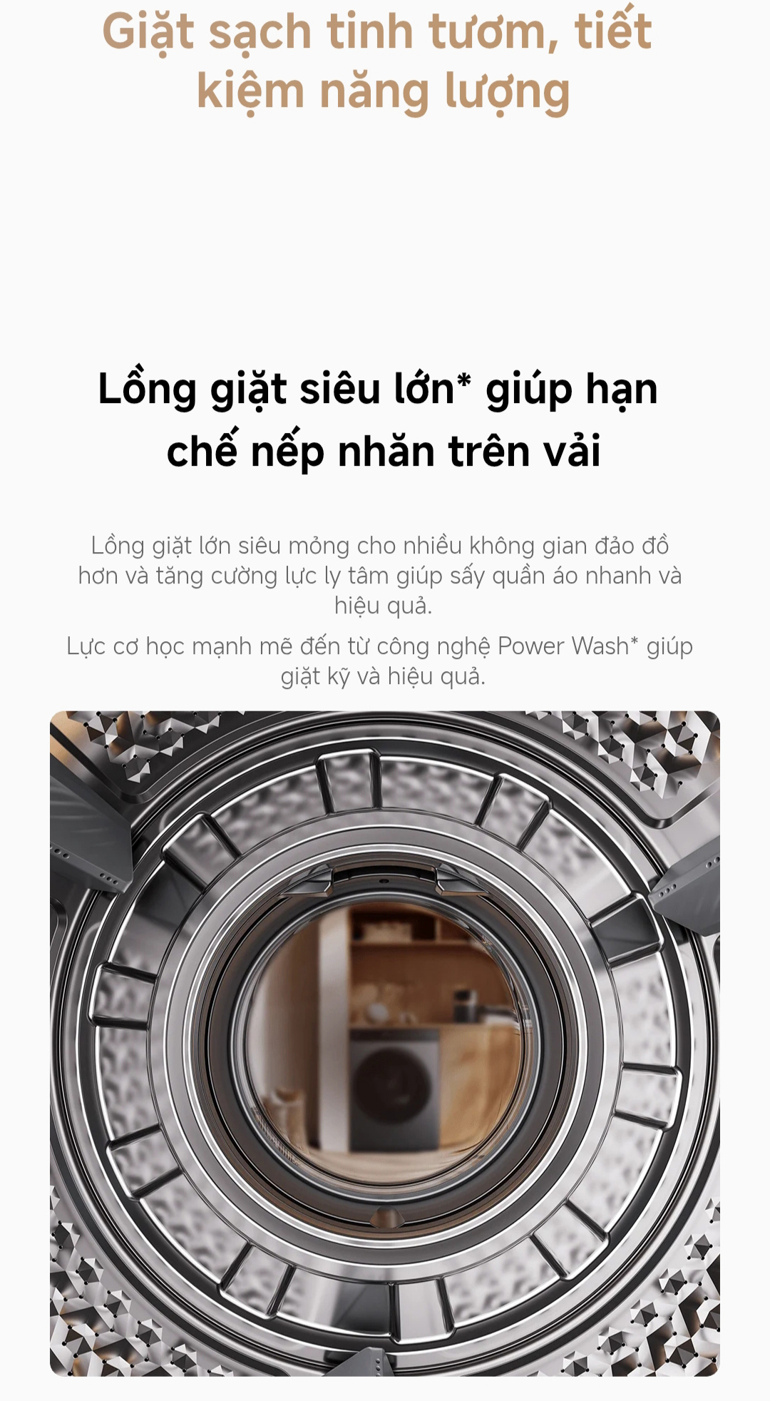 Công nghệ Power Wash mang đến lực xoáy mạnh mẽ, giặt sạch sâu nhưng vẫn giữ sợi vải nguyên vẹn.