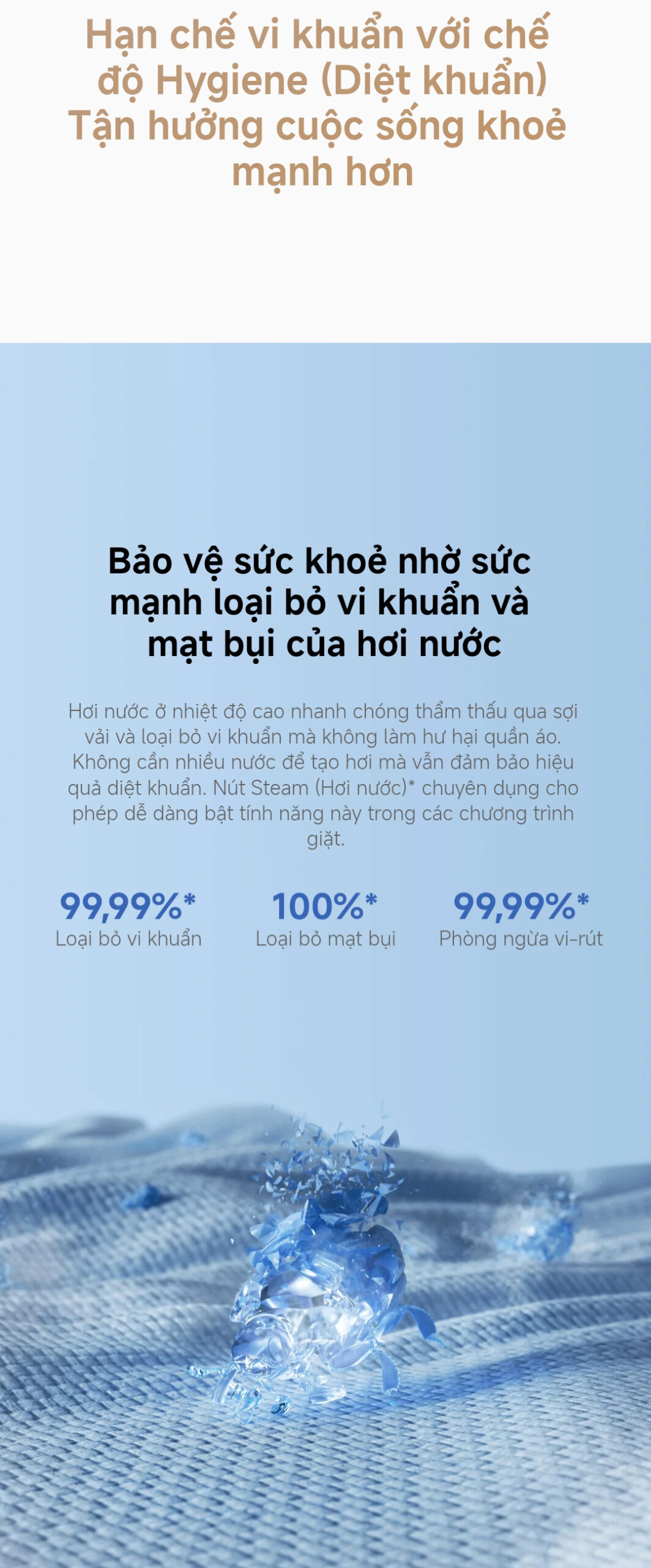 Hơi nước nóng thẩm thấu sâu vào sợi vải, loại bỏ vi khuẩn và virus lên đến 99,99%.