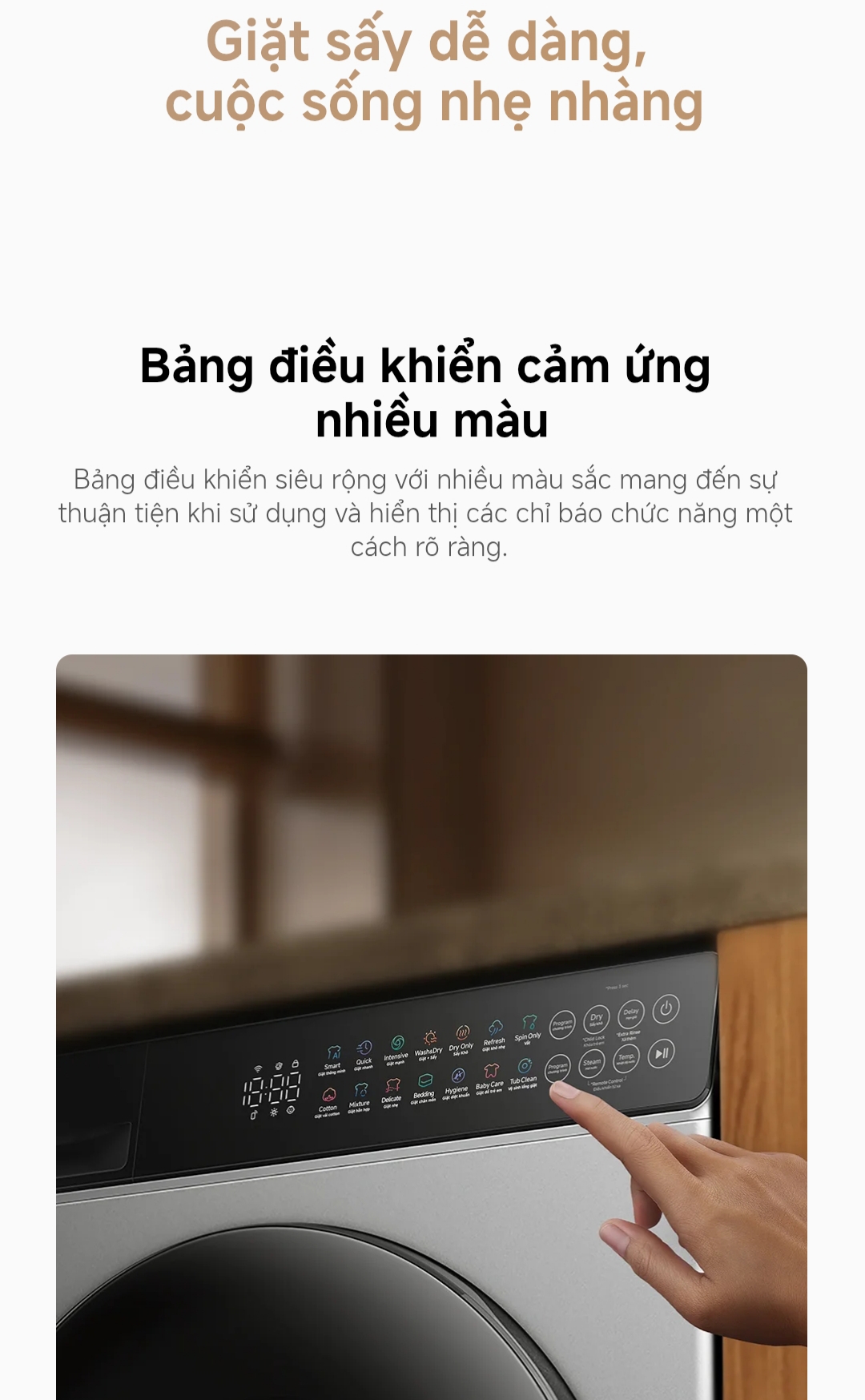 Bảng điều khiển cảm ứng đa màu – Hiện đại và tiện lợiMáy sở hữu bảng điều khiển cảm ứng siêu rộng với nhiều màu sắc hiển thị.