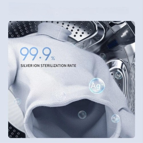Máy giặt sấy Xiaomi MJ203 - Giặt 10kg sấy 7kg được trang bị công nghệ ion bạc khử trùng tiên tiến, có khả năng loại bỏ lên đến 99,9% vi khuẩn và mạt bụi trên quần áo. Kết hợp với dòng nước công suất cao và nhiệt độ giặt ổn định, máy không chỉ làm sạch hiệu quả bề mặt vải mà còn tiêu diệt vi khuẩn và tác nhân gây dị ứng sâu bên trong sợi vải.