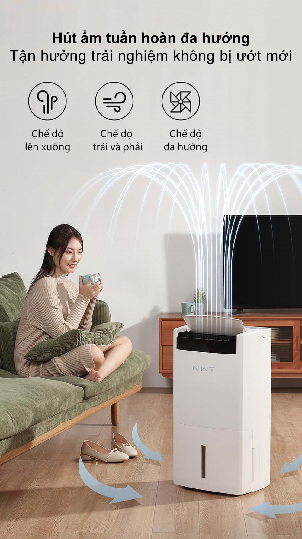 Máy hút ẩm Xiaomi New Widetech 24L được trang bị chế độ hút ẩm đa hướng, giúp kiểm soát độ ẩm hiệu quả trên toàn bộ không gian. Với khả năng hoạt động linh hoạt theo nhiều hướng như lên, xuống, trái, phải và cả chế độ vòm, máy đảm bảo phân phối không khí đều khắp phòng, bảo vệ mọi ngóc ngách khỏi tình trạng ẩm mốc và không khí ngột ngạt.