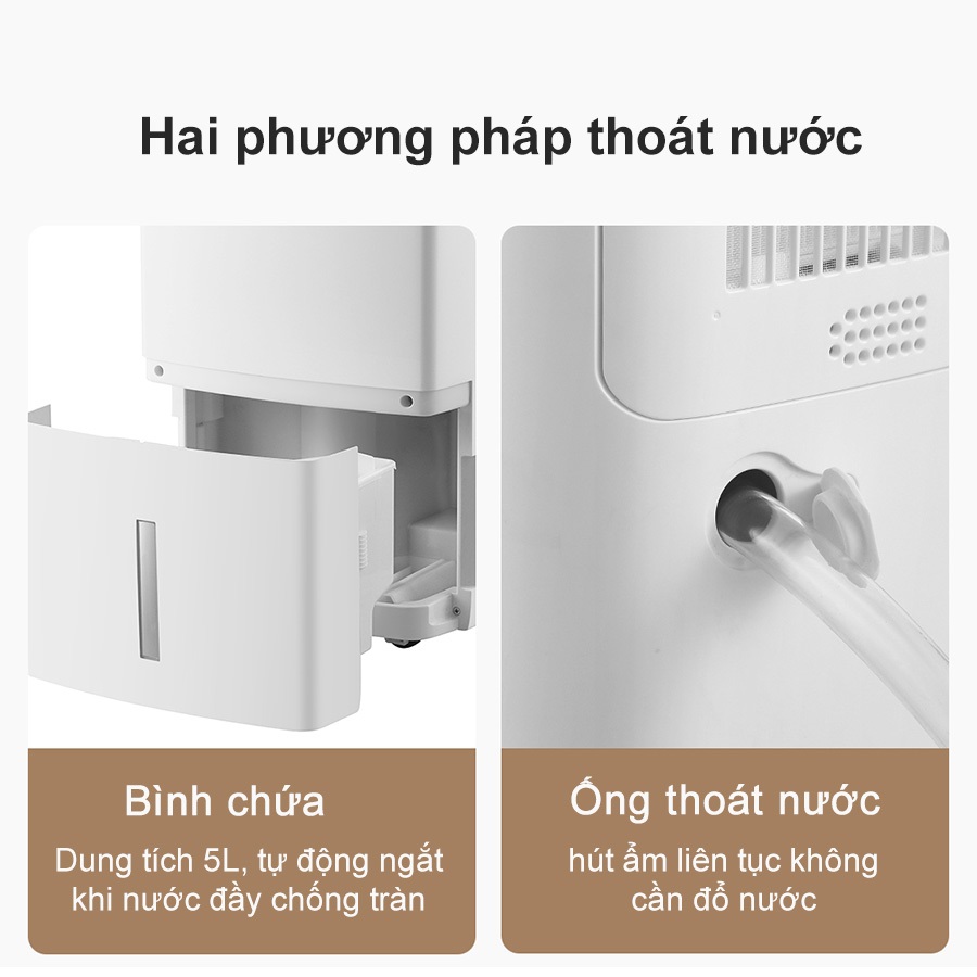 Ngoài ra, bạn có thể sử dụng ống thoát nước liên tục, giúp máy hoạt động không gián đoạn mà không cần đổ nước thủ công. Tính năng này mang lại sự tiện lợi tối đa, giúp bạn duy trì không gian khô thoáng mà không cần lo lắng về việc quản lý nước thải.