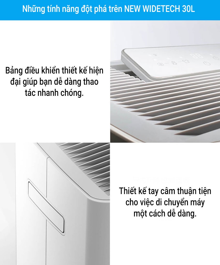 Máy hút ẩm không khí thông minh NEW WIDETECH 30L có công suất hút ẩm lên đến 30L/ngày, phù hợp cho không gian rộng 100m². Với thiết kế hiện đại, vận hành êm ái và điều khiển thông minh qua ứng dụng di động, đây là giải pháp tối ưu giúp kiểm soát độ ẩm, bảo vệ sức khỏe và không gian sống của bạn.