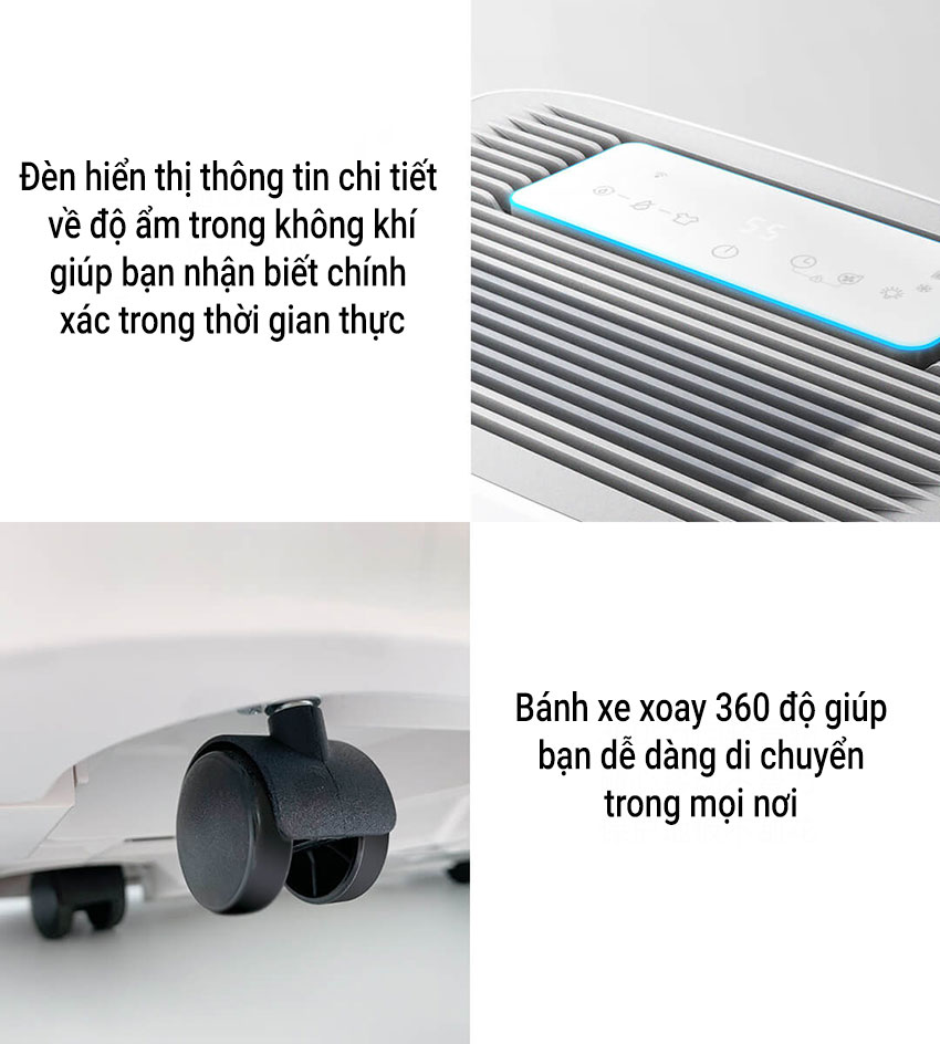 Máy hút ẩm New Widetech 30L được trang bị đèn hiển thị thông minh, giúp bạn theo dõi độ ẩm trong không gian một cách trực quan và chính xác theo thời gian thực. Nhờ đó, bạn có thể dễ dàng điều chỉnh chế độ phù hợp để duy trì môi trường lý tưởng. Bên cạnh đó, hệ thống bánh xe xoay 360 độ giúp bạn di chuyển máy linh hoạt đến bất kỳ vị trí nào trong nhà mà không tốn nhiều công sức, mang lại trải nghiệm sử dụng thuận tiện và thoải mái.