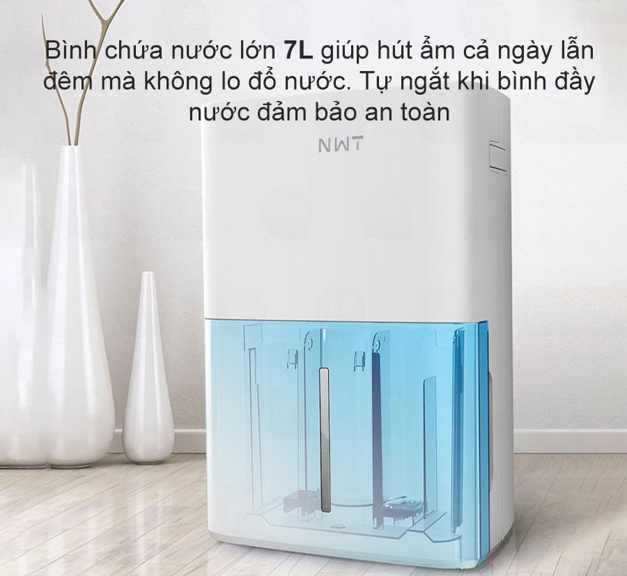 Bình chứa nước dung tích 7L của máy hút ẩm New Widetech 30L cho phép thiết bị vận hành liên tục trong thời gian dài mà không cần thường xuyên đổ nước. Nhờ đó, bạn có thể yên tâm sử dụng máy suốt cả ngày và đêm, đặc biệt trong những ngày độ ẩm cao. Ngoài ra, máy còn được trang bị tính năng tự động ngắt khi bình chứa đầy, ngăn chặn tình trạng tràn nước và đảm bảo an toàn tuyệt đối trong quá trình sử dụng.