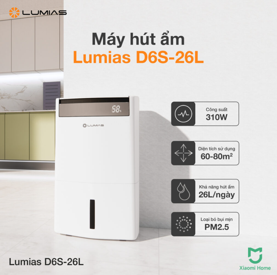 Máy hút ẩm kiêm lọc không khí 26L Lumias D6S-26L được thiết kế với công suất mạnh mẽ, lọc không khí hiệu quả và nhiều tính năng thông minh, phù hợp cho diện tích dưới 90m² như căn hộ, nhà phố, văn phòng lớn hoặc phòng khách rộng.