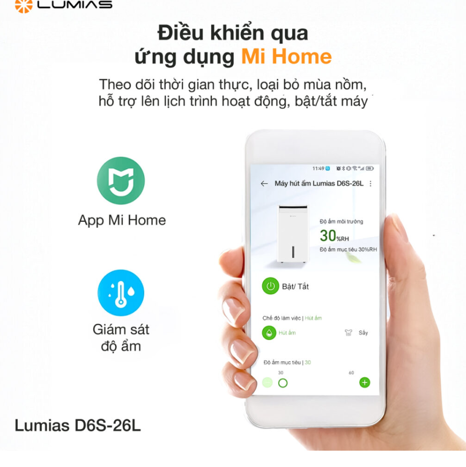 Lumias D6S-26L là lựa chọn hoàn hảo cho những không gian rộng tới 90m². Thiết bị không chỉ kiểm soát độ ẩm tối ưu mà còn mang lại bầu không khí trong lành, bảo vệ sức khỏe và tăng tuổi thọ cho đồ dùng trong gia đình.