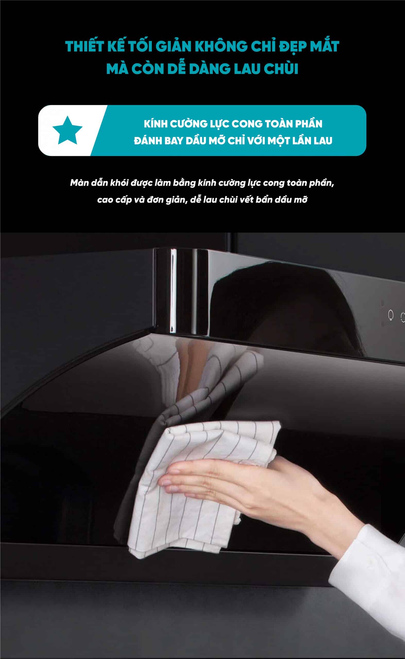 Bề mặt kính phẳng sáng bóng hạn chế bám dầu mỡ, giúp lau chùi nhanh chóng, không mất nhiều công sức,