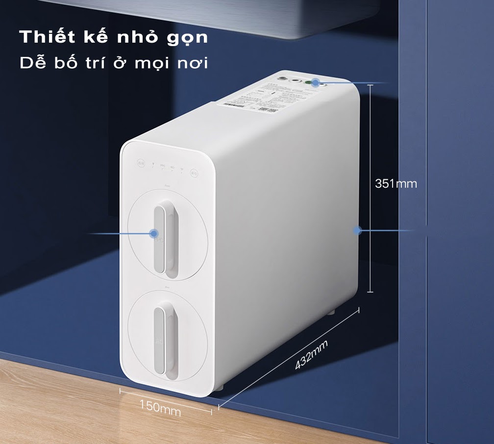 Máy có thiết kế không bình chứa, tích hợp trực tiếp đường dẫn nước, giúp hạn chế đóng cặn và ô nhiễm thứ cấp. Với kích thước chỉ 432 x 150 x 351mm, người dùng dễ dàng lắp đặt tại nhiều vị trí trong nhà mà không chiếm nhiều diện tích.