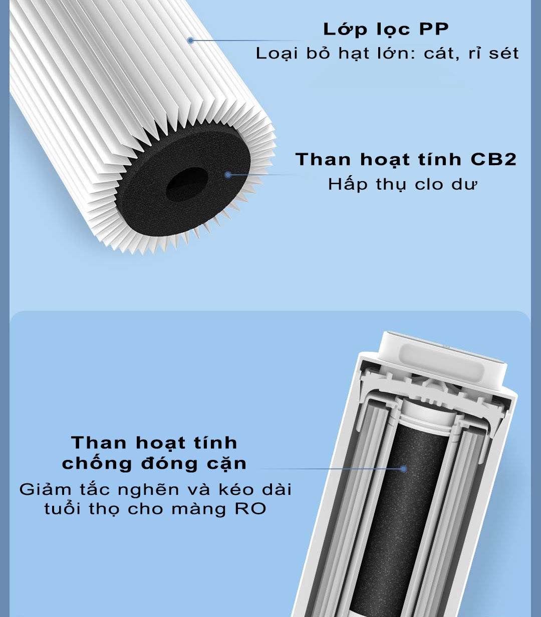 Lớp carbon thứ hai: Chuyên hấp thụ clo dư và các mùi khó chịu thường gặp trong nước máy, giúp nước trở nên dễ chịu và an toàn hơn khi sử dụng.
