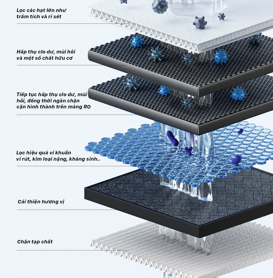 Màng Lọc RO: Loại bỏ vi khuẩn, virus, kim loại nặng, hóa chất độc hại và tạp chất hòa tan.
