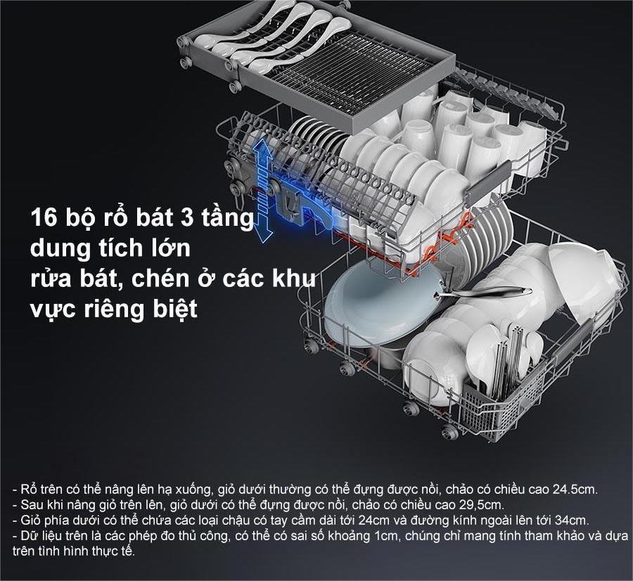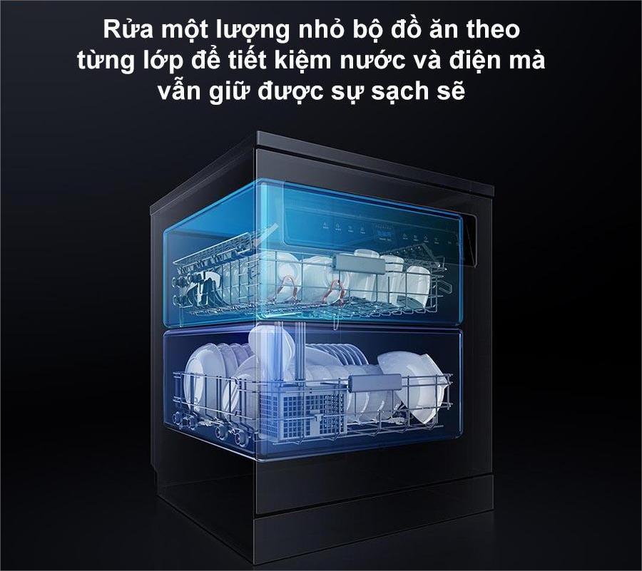 Đặc biệt, bạn có thể linh hoạt lựa chọn chế độ rửa từng tầng riêng biệt như rửa tầng trên hoặc rửa tầng dưới độc lập, giúp tiết kiệm điện năng và nước khi số lượng bát đĩa ít. Bên cạnh đó, máy cũng hỗ trợ làm sạch toàn bộ 3 tầng cùng lúc khi cần thiết, mang đến sự tiện lợi tối đa cho người dùng.