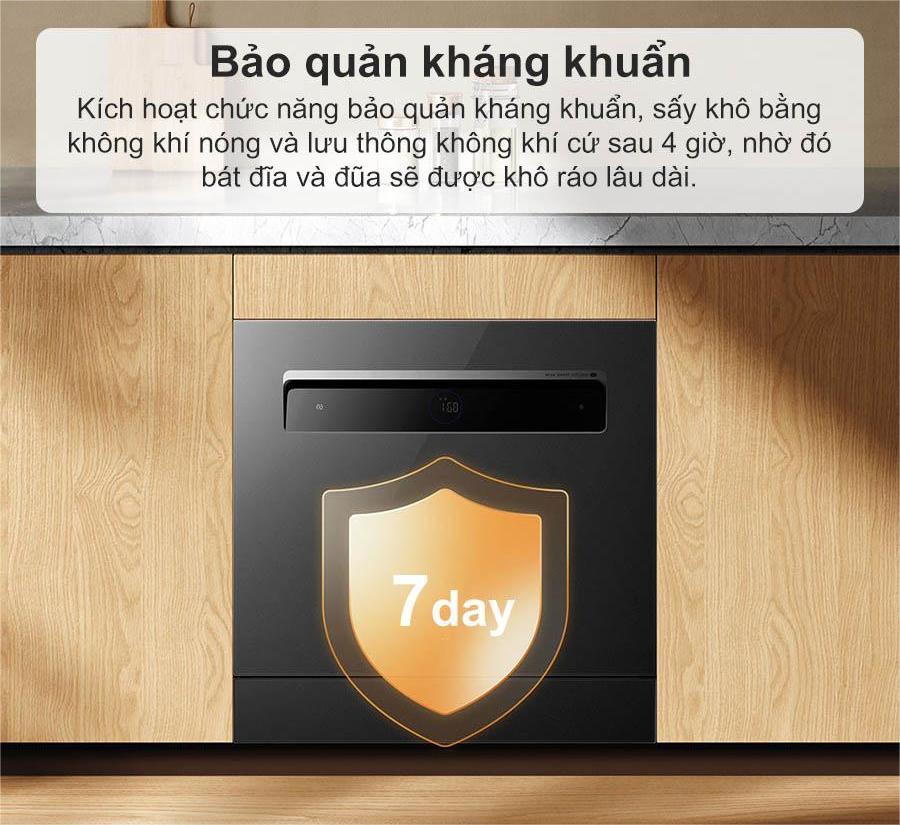 Nhờ vậy, bát đĩa không chỉ được làm sạch sâu mà còn được bảo quản trong trạng thái vô trùng và khô ráo suốt 7 ngày, giúp bảo vệ sức khỏe cho cả gia đình bạn và mang lại sự yên tâm tuyệt đối về độ an toàn vệ sinh trong sinh hoạt hàng ngày. Đây là tính năng tiên tiến góp phần nâng cao trải nghiệm sử dụng và giá trị của sản phẩm trong các gia đình hiện đại.
