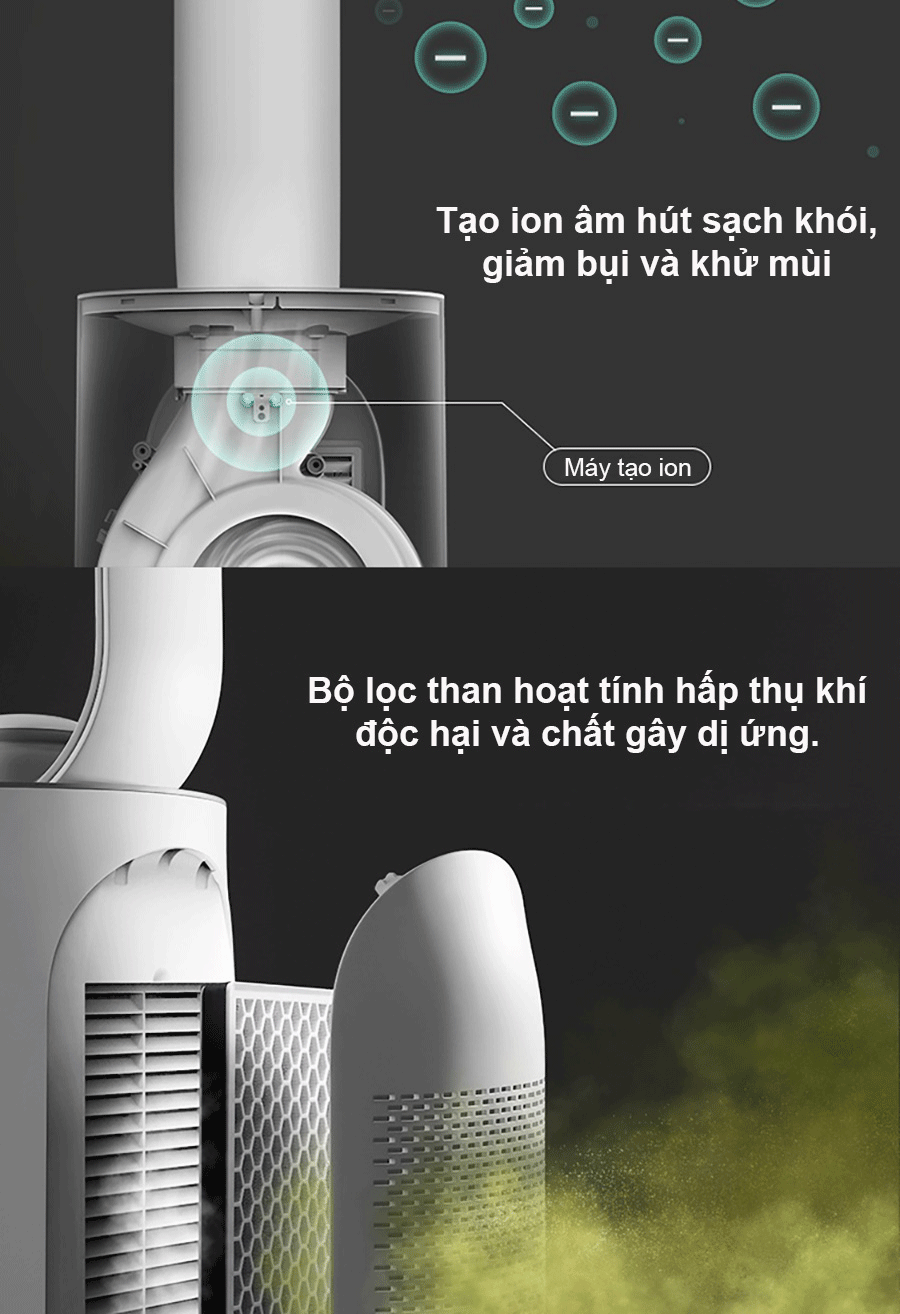 Tạo ion âm lọc không khí: Loại bỏ bụi, khói, khí độc, vi khuẩn và nấm mốc nhờ bộ lọc than hoạt tính, mang lại không gian trong lành.