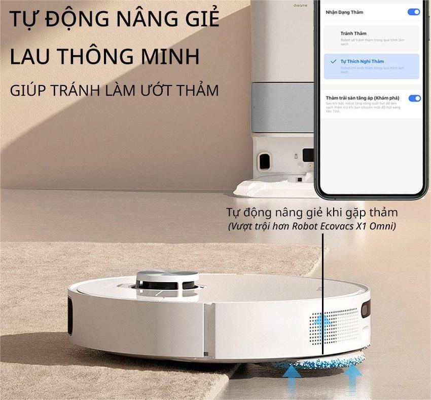 Khi gặp thảm, Dreame L10S Ultra SE sẽ tự động điều chỉnh hoạt động để đạt hiệu quả làm sạch tối ưu. Robot Dreame L10S Ultra SE sẽ ngay lập tức tăng lực hút lên mức cao nhất, giúp loại bỏ triệt để bụi bẩn, lông thú cưng và các mảnh vụn bám trên bề mặt thảm. Đồng thời, giẻ lau sẽ được tự động nâng lên, tránh tiếp xúc trực tiếp với thảm và ngăn ngừa tình trạng làm ướt hoặc hư hại thảm trong quá trình dọn dẹp. Nhờ đó, bạn hoàn toàn yên tâm về sự sạch sẽ và bảo vệ tối đa cho các loại thảm trong nhà mình.