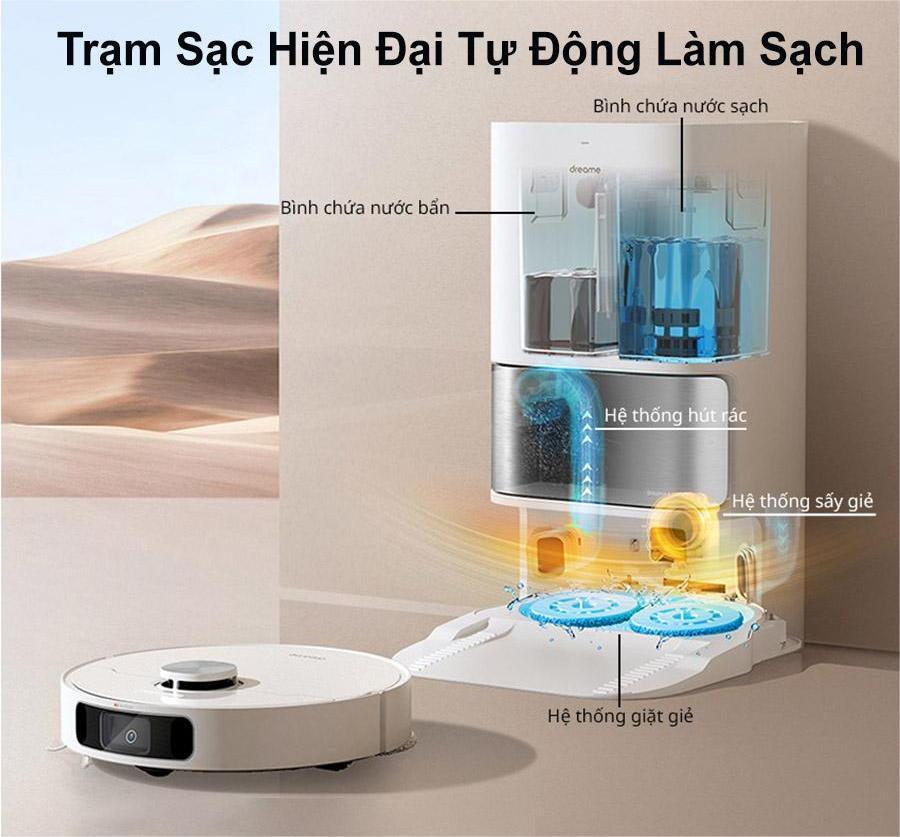 Dock sạc thông minh 3 trong 1: Gồm thùng chứa rác 3L, bình chứa nước sạch và nước bẩn 2.5L – hỗ trợ kết nối với bộ bơm xả nước tự động (mua rời), giúp robot tự động bơm nước sạch và xả nước bẩn.