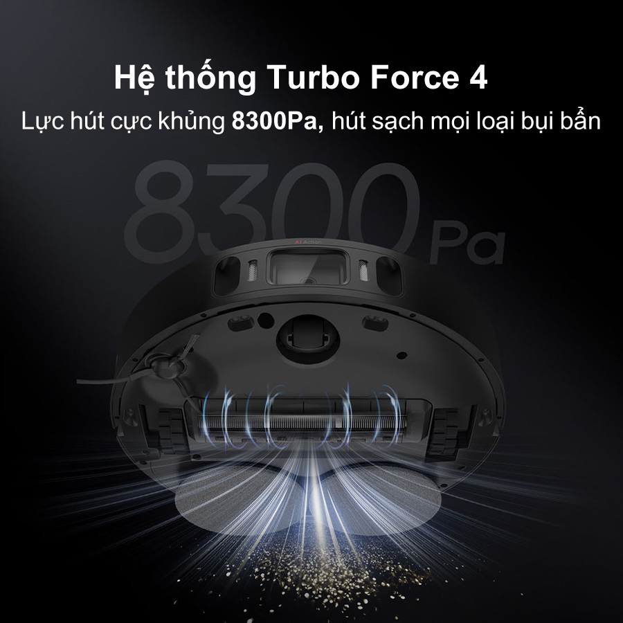 Với lực hút cực đại lên tới 8.300Pa, Robot hút bụi Dreame X30 Ultra – Bản quốc tế dễ dàng xử lý mọi loại bụi bẩn, từ bụi siêu mịn, tóc, đến cả mảnh vụn lớn. Sức mạnh này còn được nâng tầm nhờ hệ thống Turbo Force 4, giúp luồng khí mạnh mẽ hơn, ổn định hơn trong suốt quá trình làm sạch.