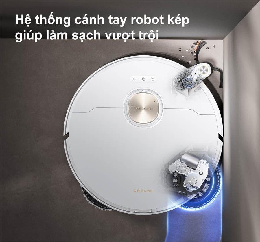 Điểm nhấn nổi bật của Dreame X40 Ultra là hệ thống cánh tay robot kép, bao gồm chổi cạnh và khăn lau xoay có thể mở rộng linh hoạt. Với khả năng mở rộng 10mm và vươn sâu tới 4cm, robot có thể dễ dàng làm sạch dưới gầm giường, gầm tủ và các khe hẹp mà các thiết bị thông thường không thể với tới.