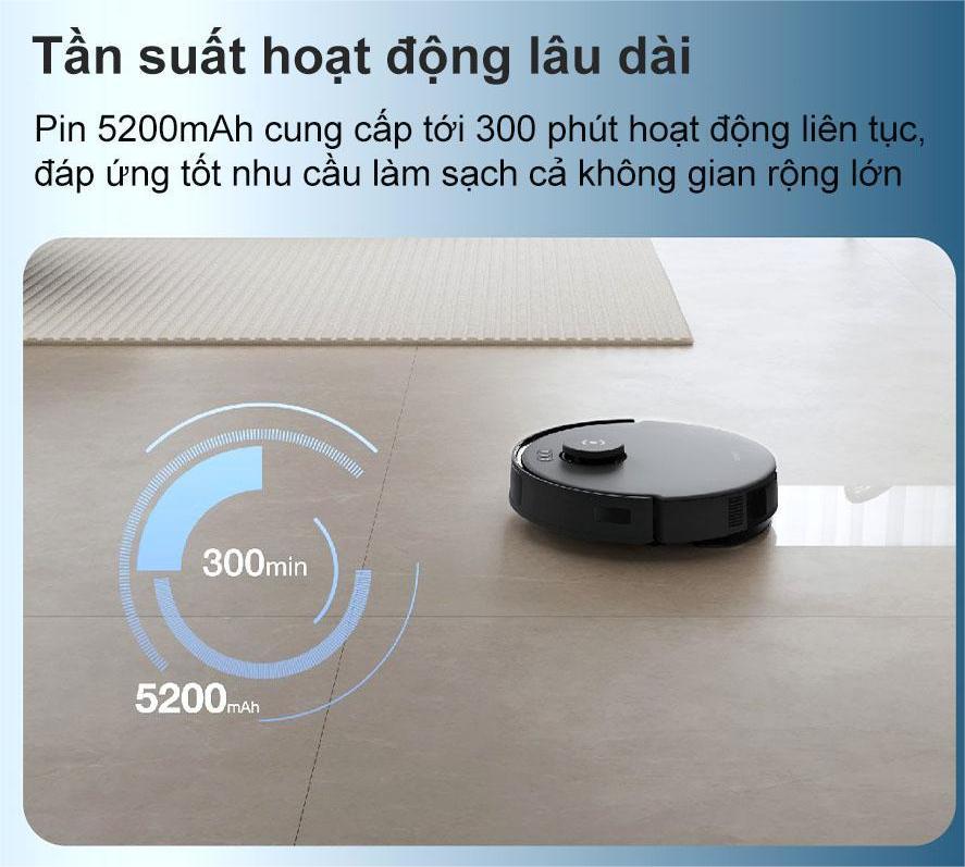 Với viên pin dung lượng lớn 5200mAh, Robot hút bụi Ecovacs Deebot N20 Pro - Bản quốc tế có khả năng hoạt động liên tục lên đến 300 phút, cho phép làm sạch hiệu quả một không gian rộng lớn với diện tích lên đến 550m² chỉ sau một lần sạc đầy.