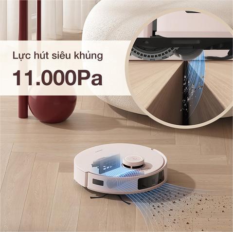 Một trong những ưu điểm nổi bật của Ecovacs Deebot T30 Pro Omni – Bản Quốc chính là lực hút cực mạnh lên đến 11.000Pa. Nhờ được trang bị động cơ tốc độ cao cùng thiết kế đường dẫn khí theo nguyên lý khí động lực học, robot dễ dàng hút sạch mọi loại bụi bẩn, từ tóc rụng đến các hạt rác nhỏ li ti trên sàn nhà.
