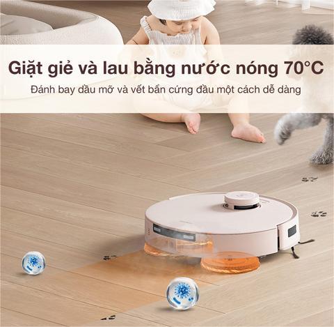 Ecovacs Deebot T30 Pro Omni – Bản Quốc sở hữu tính năng giặt giẻ bằng nước nóng với nhiệt độ lên đến 70°C, giúp loại bỏ hiệu quả dầu mỡ, các vết bẩn cứng đầu và tiêu diệt vi khuẩn một cách tối ưu. Trong suốt quá trình lau dọn, khăn lau liên tục được cấp nước nóng từ bình chứa riêng biệt, đảm bảo sàn nhà luôn được làm sạch một cách vệ sinh nhất, góp phần mang lại không gian sống trong lành và an toàn cho cả gia đình.