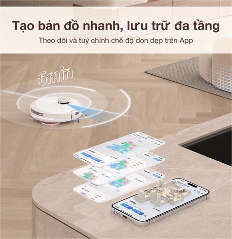 Robot có thể lưu trữ nhiều bản đồ tầng khác nhau, nhận diện không gian 3D để làm sạch theo từng khu vực cụ thể, phù hợp với nhà nhiều tầng hoặc căn hộ phức tạp.