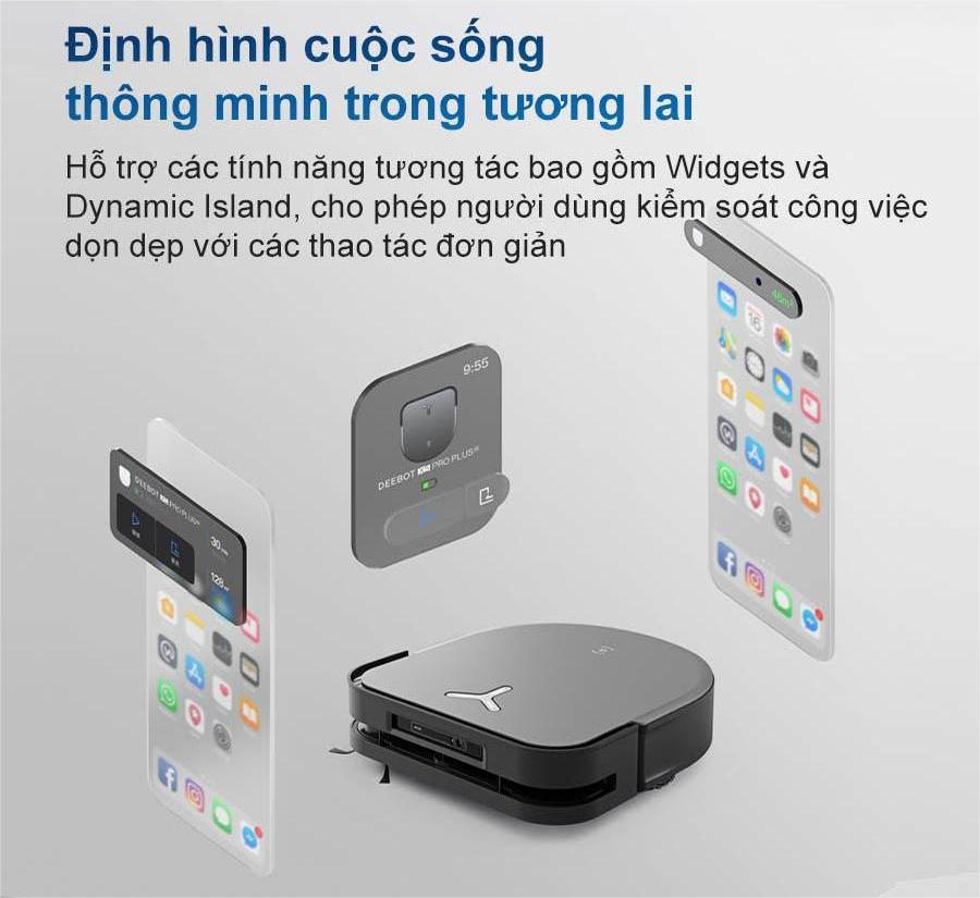 Người dùng có thể dễ dàng điều khiển Ecovacs Deebot X5 Pro Omni – Bản Quốc Tế thông qua ứng dụng ECOVACS HOME trên điện thoại, đồng thời ứng dụng còn hỗ trợ các tiện ích hiện đại như Widget trên màn hình chính, Dynamic Island dành cho các dòng iPhone mới, và tích hợp điều khiển trực tiếp qua Apple Watch.