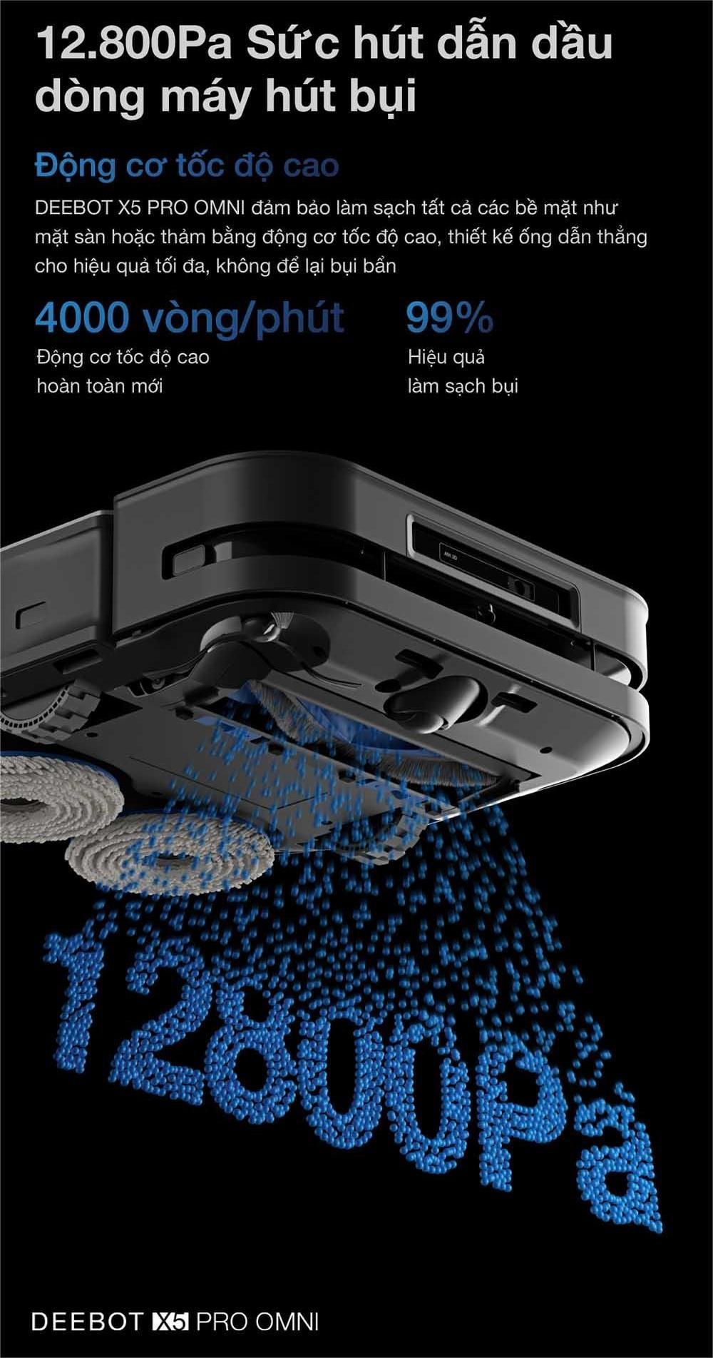 Với lực hút cực mạnh lên tới 12.800Pa, Ecovacs Deebot X5 Pro Omni – Bản Quốc Tế dễ dàng loại bỏ mọi bụi bẩn, tóc và mảnh vụn trên nhiều loại bề mặt sàn khác nhau, bao gồm cả các tấm thảm dày hay những khu vực có bụi bẩn cứng đầu.